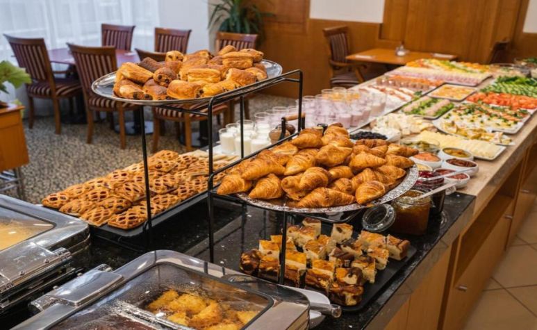 - Закуската е на богат бюфет, включваща пресни плодове, месни и млечни продукти, сладкиши, яйца, зърнени и горещи напитки ;