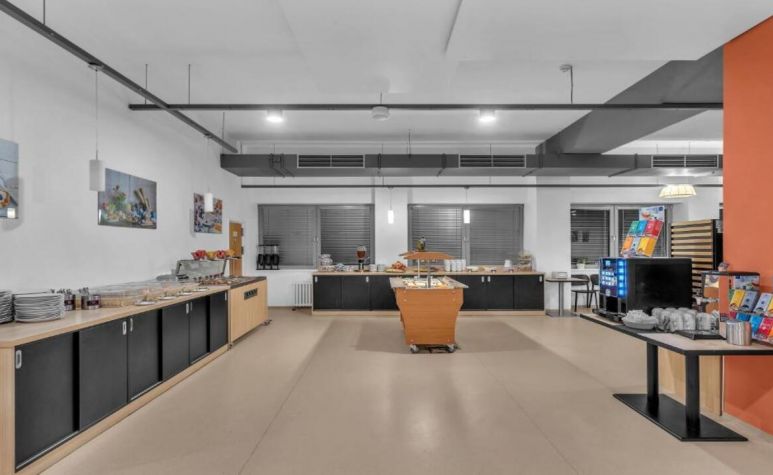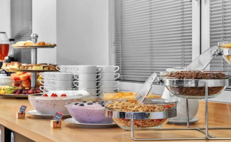 Хотелът разполага със светла зала за закуска, където се предлага континентална закуска на блок-маса – хляб, масло, конфитюр, зърнени храни, колбаси, сирена, плодове, кафе, чай и сокове
