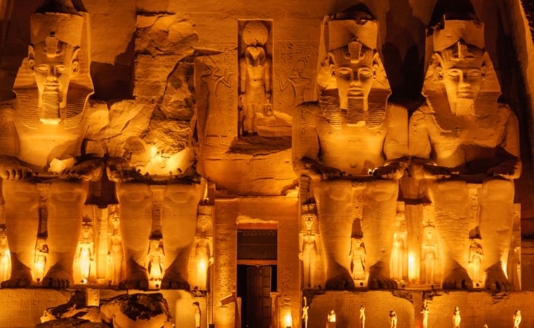 - Абу Симбел – от Асуан - Абу Симбел е комплекс от 2 храма, изградени през 13 век преди Христа. Четирите колосални статуи на Рамзес II, издигащи се пред входа му, са блестящ пример за древното египетско изкуство. Комплексът се смята за един от най-величествените от този период. При изграждането на асуанския язовир през 60-те години на 20 век се разработва грандиозен проект за преместването на храмовете. Те са разглобени и издигнати на ново място, за да бъдат спасени от покачващите се води.