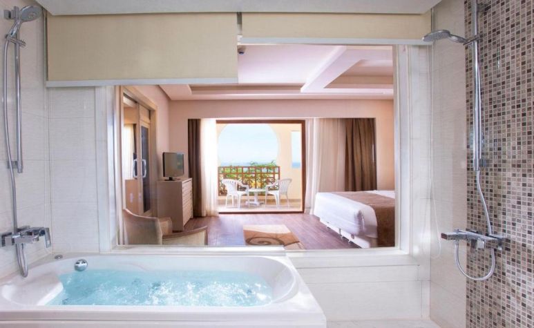 - Deluxe Junior suite -Всички апартаменти са с площ 72 m² с изглед към морето. Максимум 2 възрастни + 2 деца или 3 възрастни + 1 дете. Всеки апартамент включва една основна спалня + една всекидневна, 2 бани и джакузи.