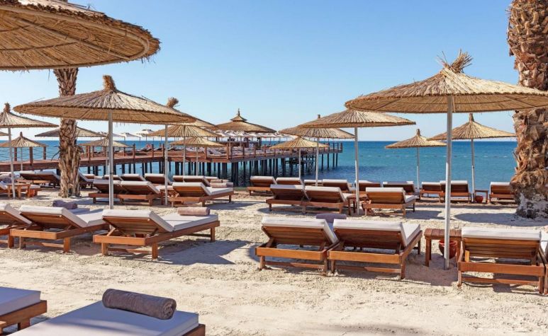 Собствен пясъчен плаж на 600 м. с две пристанища, безплатни чадъри, шезлонги и плажни кърпи.