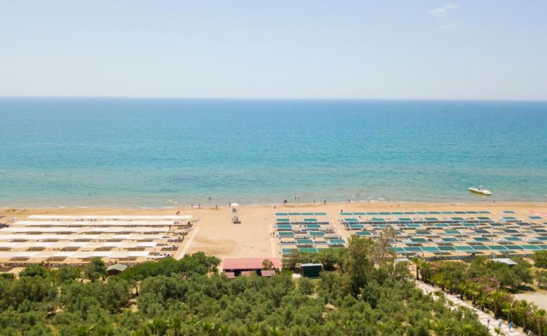 Собствен, пясъчeн. Чадъри, шезлонги, матраци и плажни кърпи на плажа и при басейна - безплатно.