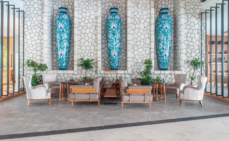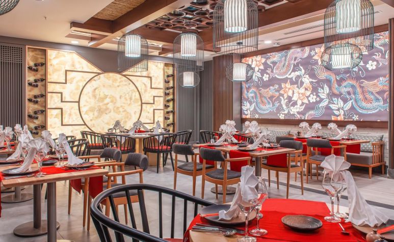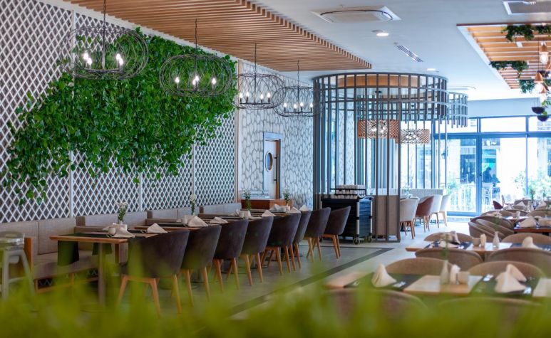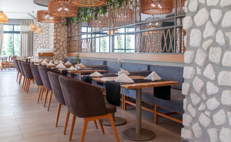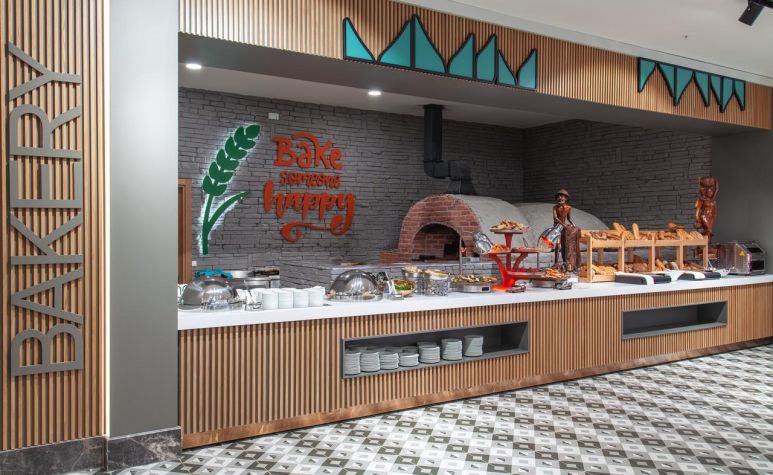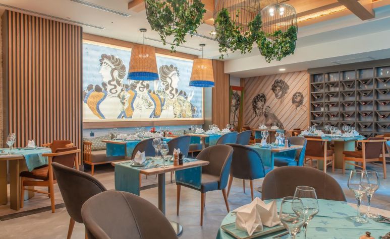 Основен ресторант, 2 а-ла-карт ресторанта (средиземноморски, китайски – 1 безплатно посещение на 1 от ресторантите при минимум 7 нощувки, с предварителна резервация), 1 снек ресторант на плажа, сладкарница, 3 бара, открит и закрит басейн, аквапарк с 4 водни пързалки, СПА център.