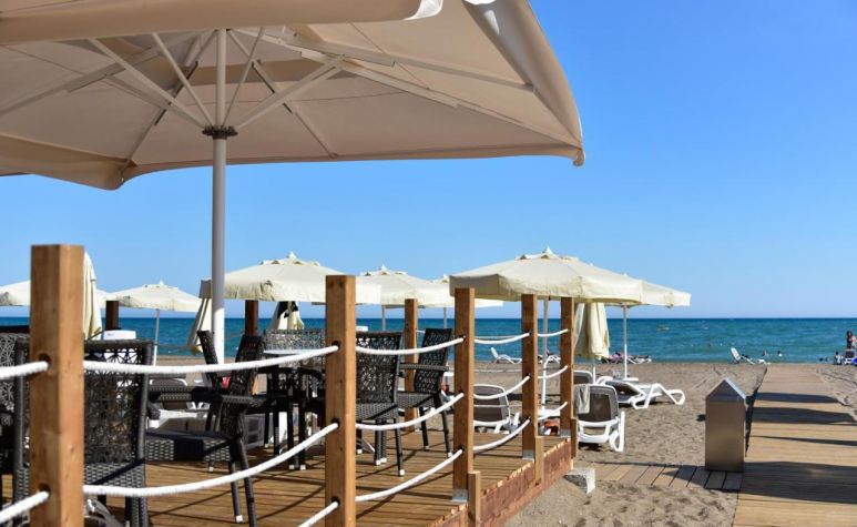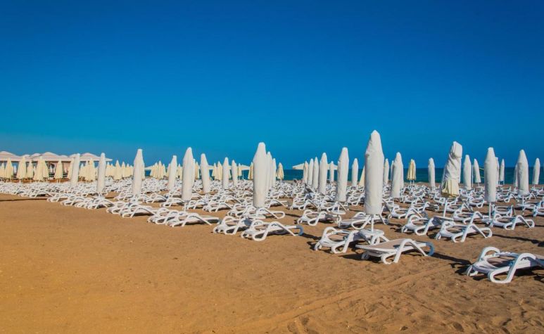 Собствен, на 450 метра от хотела. Чадъри, шезлонги и матраци на плажа и при басейна – безплатно, плажни кърпи – срещу депозит.
