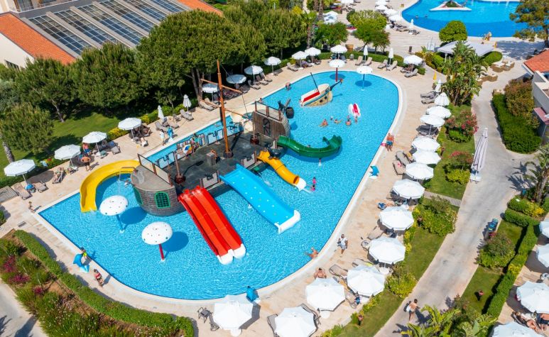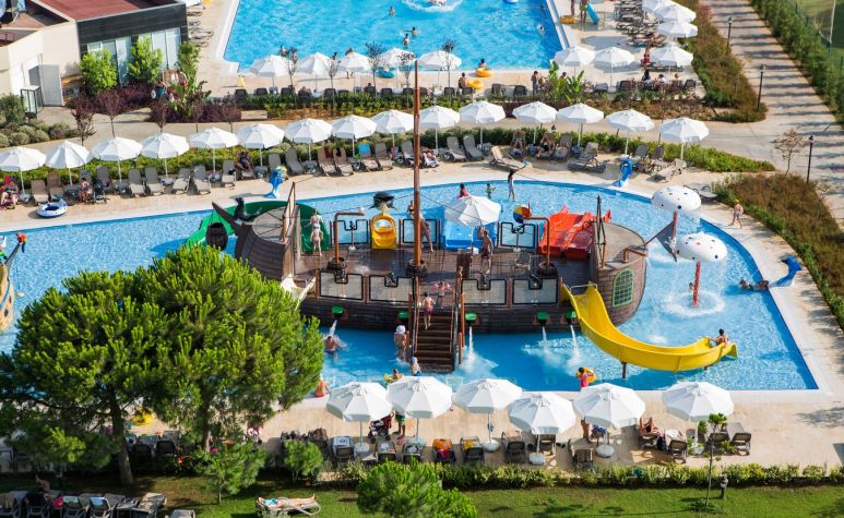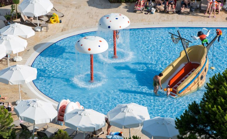 За децата: Детски открит и закрит басейн, 6 детски водни пързалки, мини клуб (4-12), детска площадка, детско меню, бебешка храна (по заявка), детска количка (платено), детегледачка (платено).