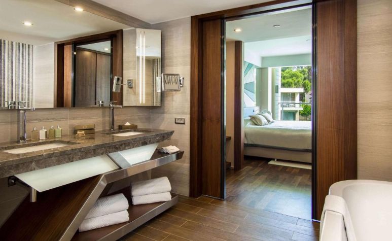 Deluxe Suite: 73 м2, 1 спалня с 1 хол, разделени с пеходна врата, мини бар, огледална телевизия, интернет, директна телефонна линия, централен климатик, сейф, балкон, сешоар, сет за чай и кафе.