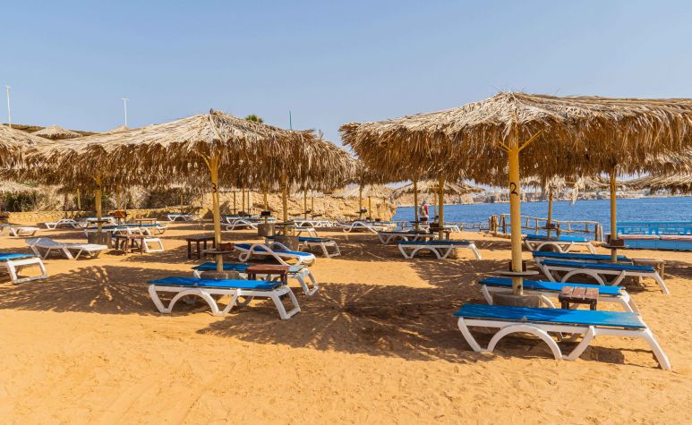 Собствен, пясъчен, коралов, на 500-600 метра от хотела. Шатъл до плажа на всеки час. Чадъри, шезлонги и плажни кърпи на плажа и при басейна – безплатно.