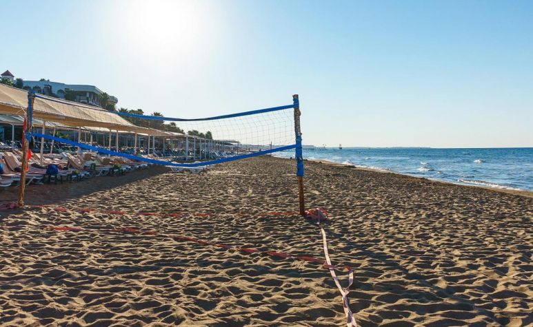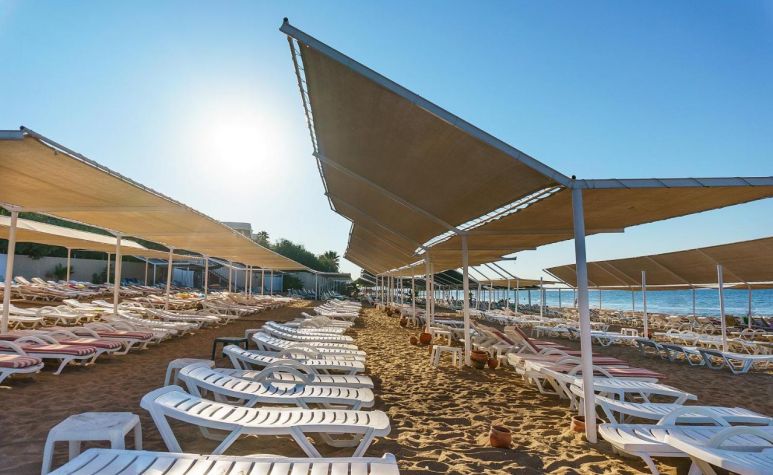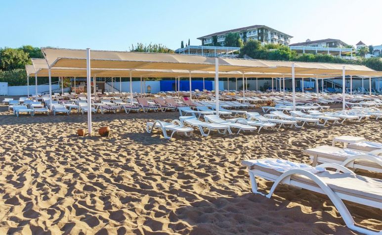 Собствен, на 500 м. от хотела, пясъчен. Безплатен шатъл до плажа (в определен часови диапазон). Чадъри, шезлонги и плажни кърпи на плажа и при басейна – безплатно.