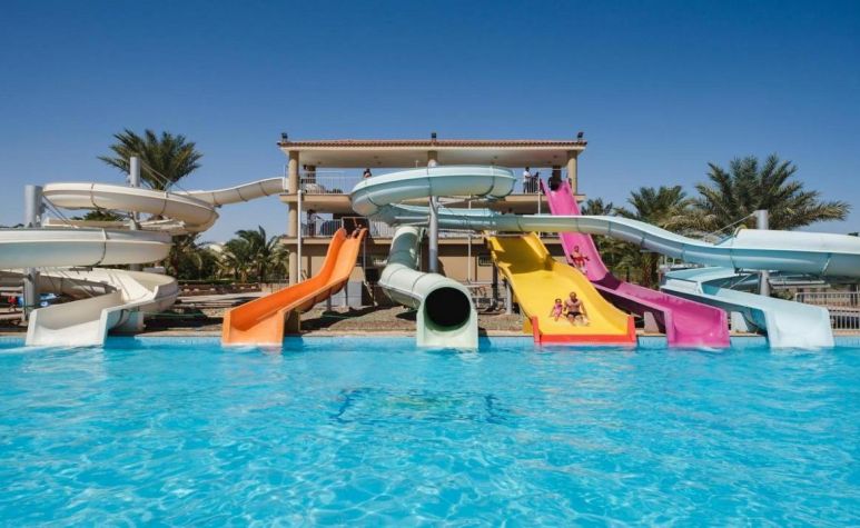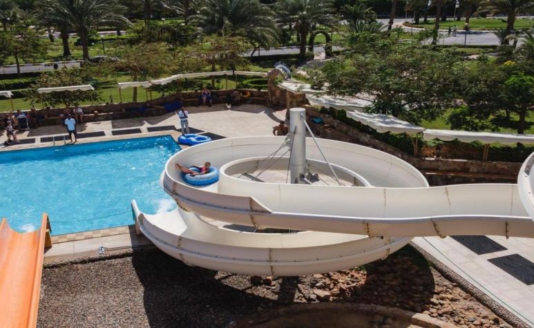 Desert Rose 5* разполага със собствен девствен пясъчен плаж с дължина от 1км, с 40 000 м² природна лагуна със златист пясък. Хотелът предлага на своите клиенти идеална атмосфера за забавления или просто да се насладят на прекрасния ненадминат климат на Червено море. Хотелът разполага с 4 плувни басейна, 1 с олимпийски размери, голям плувен басейн с палуби за слънчеви бани и бар край него, отопляем семеен плувен басейн и детски плувен басейн, специализиран за бебета и малки деца със собствен мини душ и мини столове. Като допълнение Аквапаркът предлага още и 6 водни пързалки.