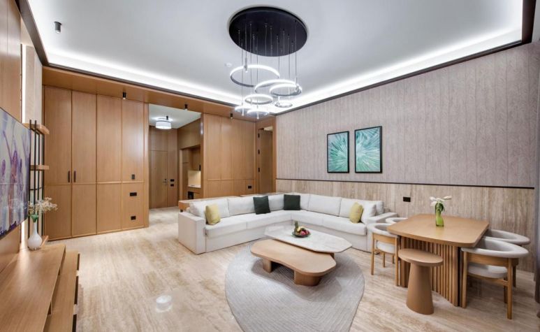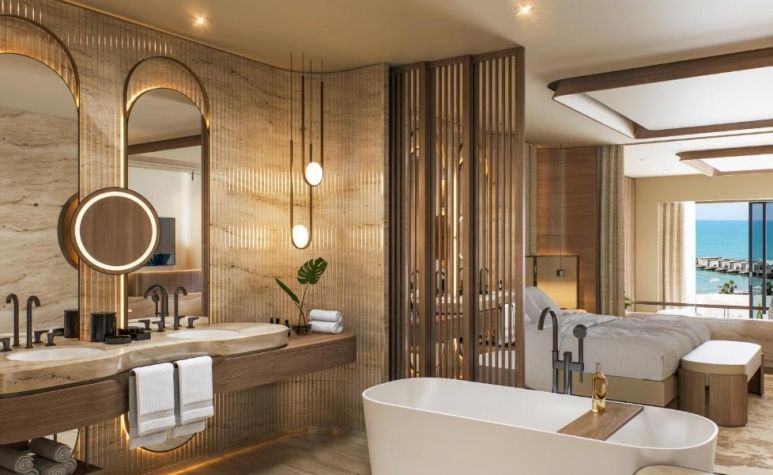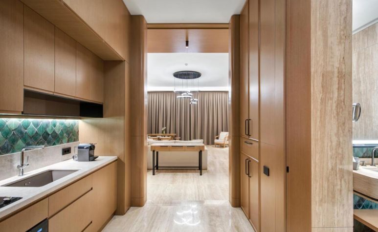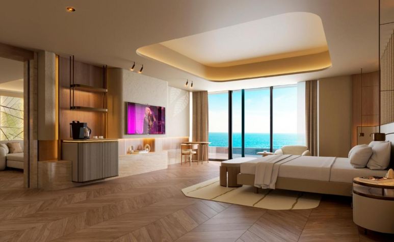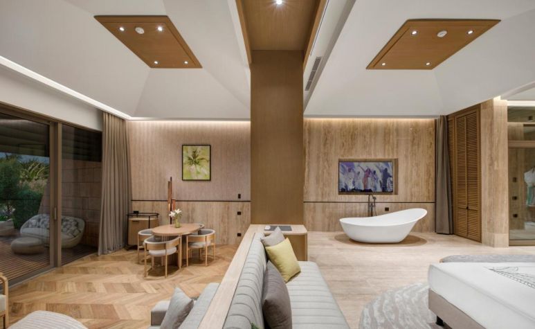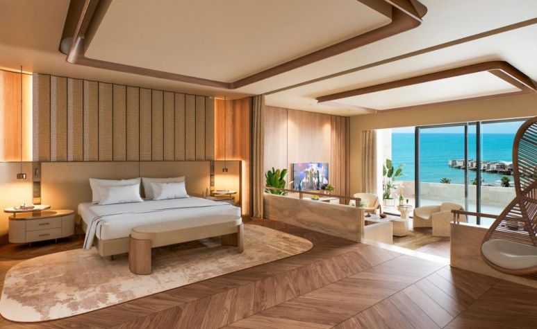 Апартаменти Main Building – Seascape Escape (1 спалня, 1 всекидневна, гледка море – 110 м2), Family Suite (2 спални, изглед градина – 125 м2), Grand Family Suite (2 спални, кухненски бокс, всекидневна, изглед градина – 185 м2), Panoramic Suite (1 спалня, кухненски бокс,  всекидневна, изглед море – 215 м2), Horizon Suite (2 спални, кухненски бокс, всекидневна, изглед море – 200 м2), Crown Horizon Suite (3 спални, кухненски бокс,  всекидневна, изглед море – 450 м2), Crown Signature Suite (5 спални, кухненски бокс, всекидневна, СПА зона, изглед море – 1700 м2), Amber Lagoon Suite (1 спалня, 1 всекидневна, изглед градина и директен достъп до общ басейн – 90 м2), Amber Lagoon Villa (2 спални, кухненски бокс, всекидневна, изглед градина и директен достъп до общ басейн – 155 м2)
