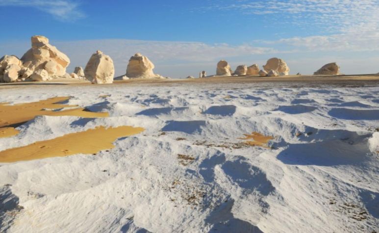 Най-общо Бялата пустиня е наречена така заради наносите от варовик и подобни минерали, образувани от пясъчните бури. През нощта тези снежнобели пясъчни хълмове спокойно могат да се объркат с гледка от полярната област.