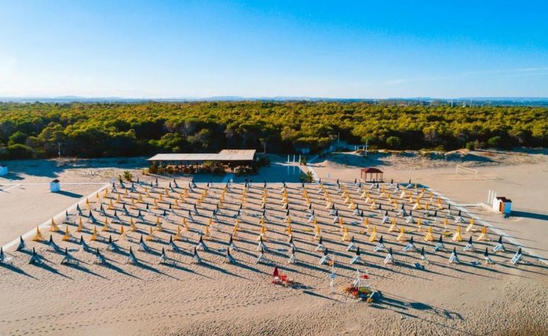 Плажът е част от комплекса с безплатни чадъри и шезлонги за клиентите. За да го достигнете, преминавате през прекрасна романтична зелена борова гора по обособени пътеки, или с минибусчета, които се движат през целия ден. Плажът е дълъг и широк, с фин пясък и безплатни чадъри и шезлонги.