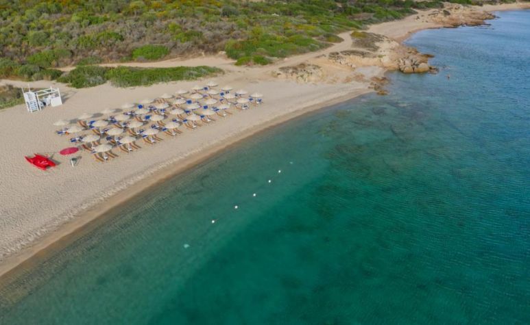 Чадър и два шезлонга по избор, при поискване с доплащане и в зависимост от наличността на "White Beach" с фин пясък и полегато море на около 600 м от хотела по черен път (проходим само пеша)
