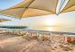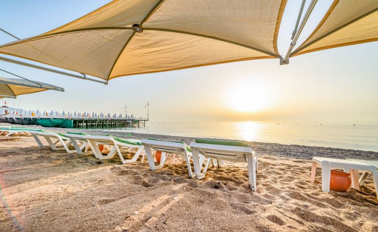 Собствен, пясъчно – чакълест. Чадъри, кърпи, шезлонги и матраци на басейна и на плажа – безплатно.