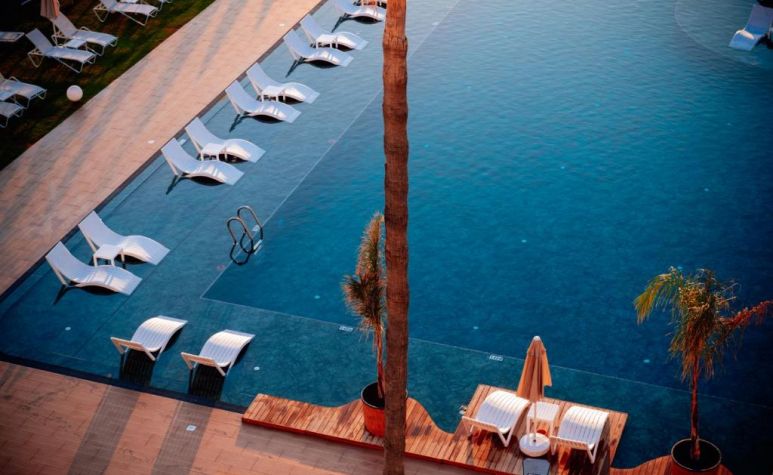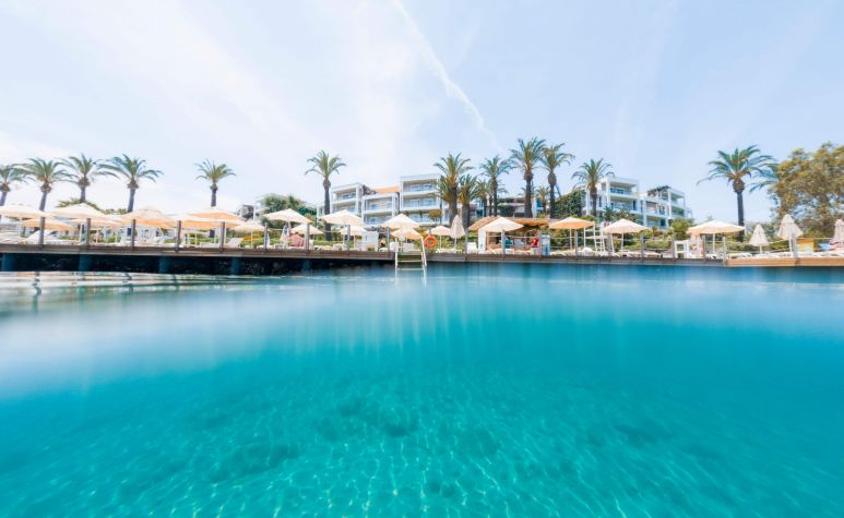 Собствен пясъчен плаж и платформа. Притежател на сертификат "Син флаг" с дължина 250 м. Бар на плажа – безплатно. Чадъри, шезлонги, матраци – безплатно. Плажни кърпи: безплатно. При басейна: чадъри, шезлонги, матраци – безплатно.