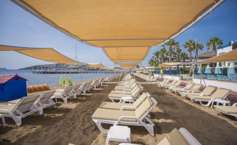 Собствен - пясъчен. Чадъри и шезлонги - на плажа и при басейна - безплатно. Плажни кърпи срещу депозит.