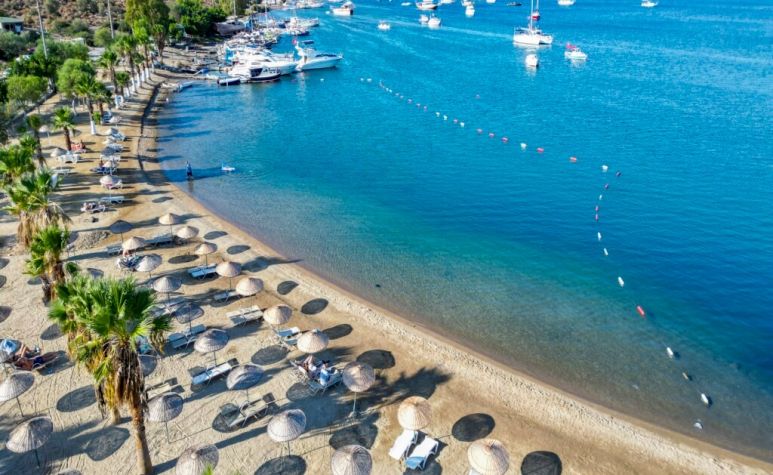 Собствен, пясъчно - чакълест. Чадъри, шезлонги и плажни кърпи на плажа и при басейна - безплатно.