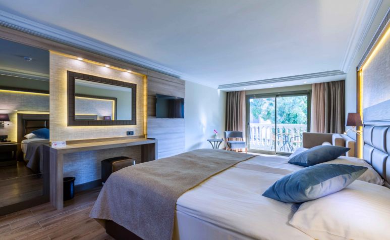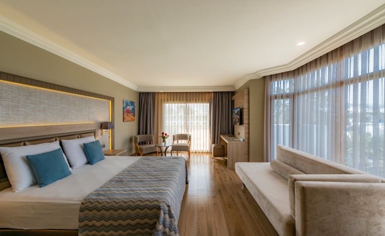 Стаи Main Building:  Land view room (спалня със зона за сядане, баня, изглед суша - 35 м²), Standard Room Side Sea View (спалня със зона за сядане, баня, със страничен изглед море - 32 м²), Deluxe room garden view (спалня, баня, с изглед градина, стаи в къщички - 30 м²), Superior garden room (1 спалня, 1 хол, 1 баня, изглед градина, стаи в къщички - 35 м²), Deluxe room swim-up (спалня, баня, с директен достъп до общ басейн, с изглед суша, стаята е предназначена само за възрастни (16+) - 35 м²), Junior suite (1 спалня, 1 хол, 1 баня, с изглед градина, стаи в къщички - 45  м²), Senior suite room (2 спални, 1 хол, 2 бани, с изглед градина, стаи в къщички - 55 м²).