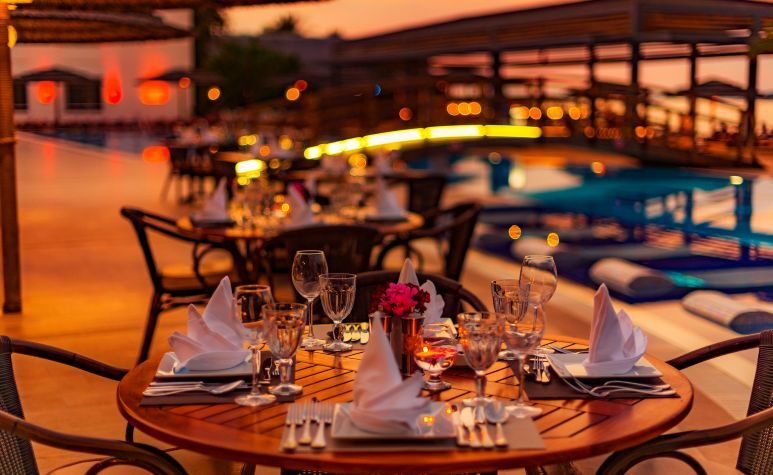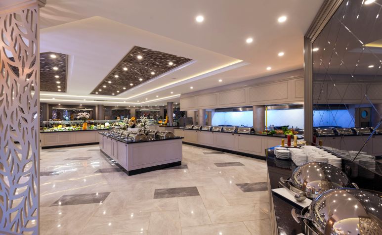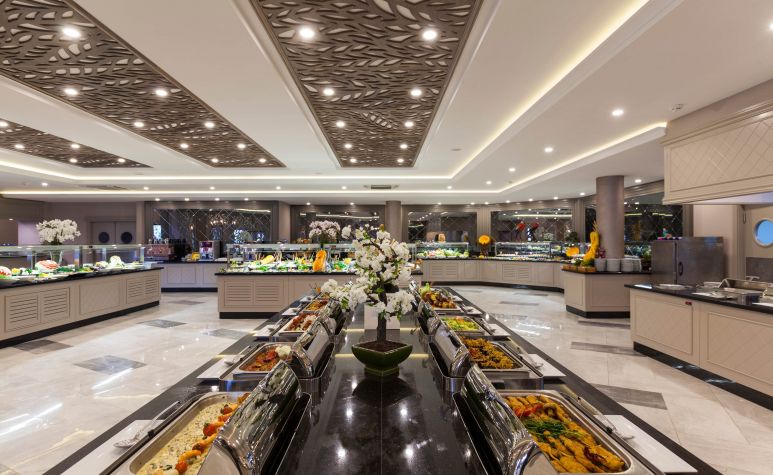 Oсновен ресторант Karya, два а-ла-карт ресторантa (турски Begonvil и рибен Teras Seafood - с предварителна резервация, едно безплатно посещение за престой от минимум три нощувки), 6 бара - Palm Bar, Roof Bar, Pool Bar, Sea Bar, Snack Bar и Olive Bar.