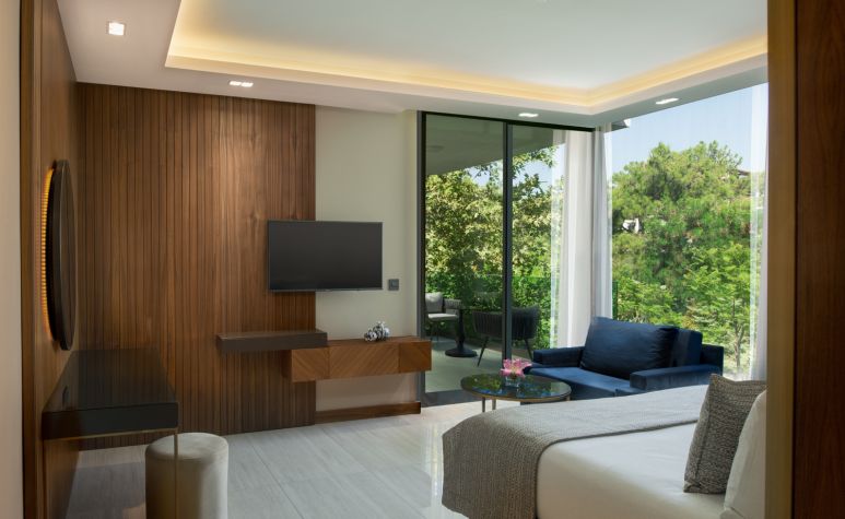 Частни вили: 21 Aphrodite Villa 190 m² (гледка към морето, на първия етаж: хол, трапезария, кухня, баня; на втория етаж – 2 спални с врата, 2 бани, гардеробна, балкон, собствен басейн (1.40м дълбочина), VIP зона на плажа, максимум 5 души капацитет, VIP обслужване). 14 Apollon Villa 280 m² (с гледка към морето, на първия етаж: хол, трапезария, кухня, спалня с врата, гардеробна; на втория етаж – 3 спални с врати, 3 бани, балкон, тераса; собствен басейн (1.40м дълбочина), VIP зона на плажа, максимум 7 души капацитет, VIP обслужване). 11 Poseidon Villa 330 m² (с гледка към морето, на първия етаж: хол, спалня с гардеробна, трапезария, кухня, баня; на втория етаж: 4 спални с врати, 4 бани, балкон, тераса; собствен басейн, максимум капацитет 8 души, VIP зона на плажа, VIP обслужване); 3 Hermes Villa (365 m², 1 основна спалня + 4 допълнителни, просторна дневна, собствен басейн), Presidential Villa (800 m², 6 спални, дневна, трапезария, възможност за личен готвач). *Информация за цени за частните вили ще получите при индивидуално запитване.