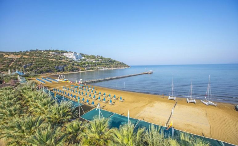 Собствен, пясъчен с дължина 300 м, притежаващ сертификат "Син флаг" и кей със 150 м дължина. Чадъри, шезлонги, матраци и плажни кърпи на плажа и при басейна - безплатно.