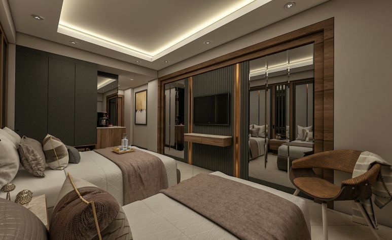 Хотелът разполага с 338 стаи, разпределени в 2 блока -  94 стандартни стаи с изглед градина (20 кв.м.), 95 стандартни стаи с изглед море (25 кв.м.), 20 фамилни стаи с изглед море (две свързани стаи, 35 кв.м.), 3 стаи за инвалиди (25 кв.м.) и промо стаи (без тераси),  37 стандартни стаи (25 кв.м.),11 лукс стаи с директен достъп до басейна (две свързани стаи, 40 кв.м.), 16 дуплекс лукс фамилни стаи (две свързани стаи, 39 кв.м.), 57 лукс фамилни стаи (две свързани стаи, 42 кв.м.), и 3 делукс суита (две свързани стаи, голяма тераса с джакузи, 61 кв.м.). Всички стаи са оборудвани с климатик, телевизор, телефон, баня с душ, сешоар, сет за чай/кафе, мини бар (платен), сейф (платен), балкон. Почистване на стаите - всеки ден, смяна на спалното бельо - 3 пъти седмично, смяна на кърпите - 3 пъти седмично.