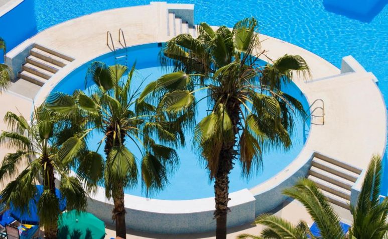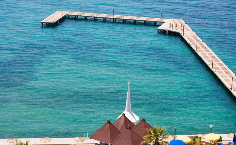 Платформа с дължина 150 м. и ширина 20 м. Чадъри, шезлонги, матраци и плажни кърпи на плажа и при басейна - безплатно.