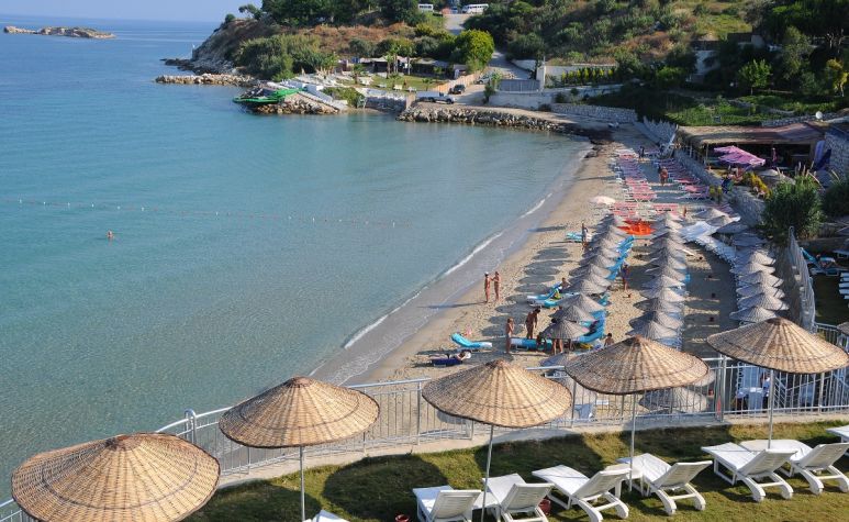 Собствен, пясъчен с дължина 300 м., притежаващ сертификат "Син флаг". Чадъри, шезлонги, матраци и плажни кърпи на плажа и при басейна - безплатно.
