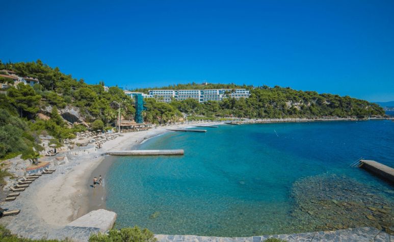 Собствен, пясъчен с дължина 1200 м, притежаващ сертификат "Син флаг" и платформа. Чадъри и шезлонги на плажа и при басейните – безплатно. Плажни кърпи - безплатно.