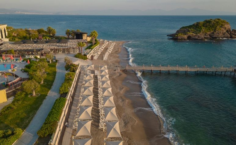 Собствен, пясъчно-чакълест, притежаващ сертификат "Син флаг" и платформа. Чадъри, матраци, шезлонги и плажни кърпи при басейна и на плажа – безплатно.