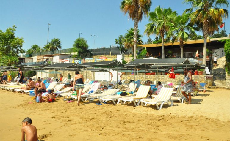 Собствен, чакълест, на 450 м, през подлез. Чадъри, шезлонги на плажа и при басейна – безплатно. Плажни кърпи – срещу заплащане.