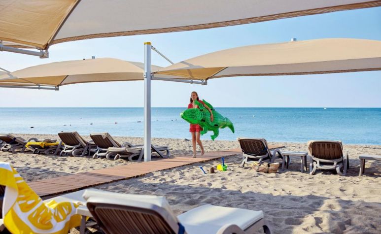 Собствен, пясъчен, с дължина на плажната ивица 250 м. и кей 400 м2. Чадъри, шезлонги и матраци на плажа и при басейна - безплатно. Плажни кърпи – безплатно.