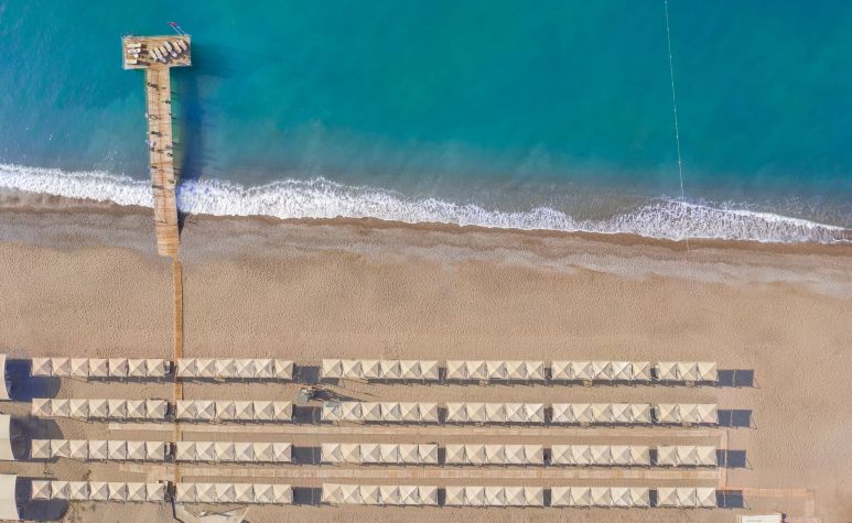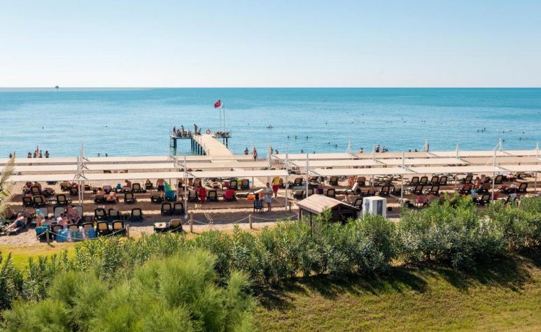 Собствен, пясъчно - чакълест. Чадъри, шезлонги и плажни кърпи на плажа и при басейна – безплатно.