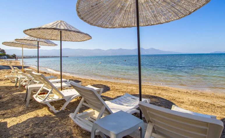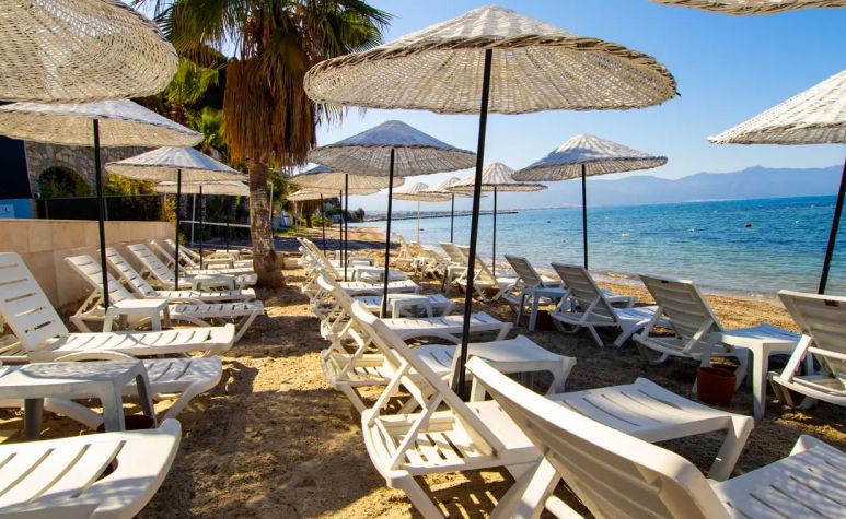 Плаж – собствен, пясъчно-чакълест. Чадъри и шезлонги на плажа и при басейна – безплатно.