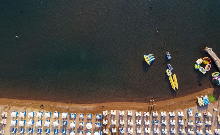 Собствен, пясъчен. Чадъри, шезлонги и матраци на плажа и при басейна – безплатно.