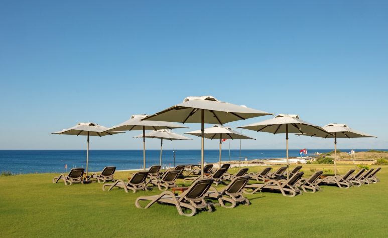 Собствен, пясъчен с дължина 450 м. Чадъри, шезлонги, матраци и плажни кърпи на плажа и при басейна - безплатно.