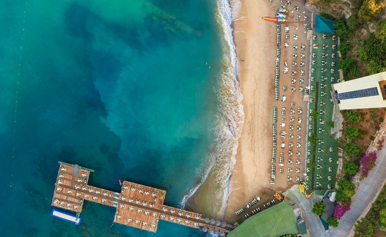 Собствен, пясъчно-чакълест плаж, на 200 метра от хотела с дължина на плажната ивица 350 м, удостоен със сертификат "Син флаг". Достъп до плажа с шатъл. Снек бар на плажа (безплатно). Чадъри, шезлонги и матраци на плажа и при басейна – безплатно. Плажни кърпи – безплатно.