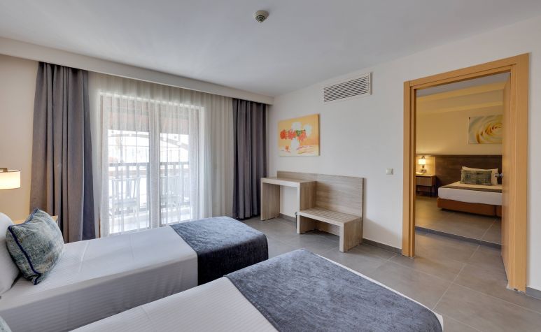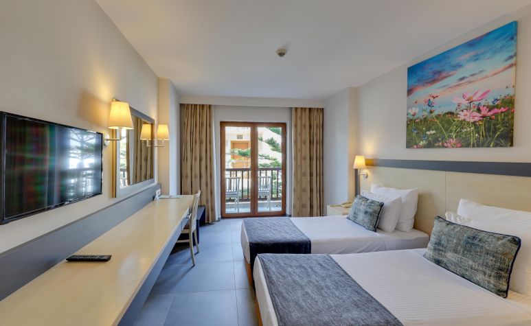 Хотелът разполага с общо 214 стаи, разположени в 5-етажна основна сграда, от които Promotion room (1 спалня, 1 баня, без тераса - 19 м2), Standard Room Garden View (1 спалня, 1 баня, изглед градина- 19 m²), Sea view room (1 спалня, 1 баня, изглед море - 19 m²), Family garden room (с две отделни спални с врата между тях, 1 двойно и 2 единични легла, изглед суша - 38 m²) Family room sea view (с две отделни спални с врата между тях, 1 двойно и 2 единични легла, изглед море - 38 m²).