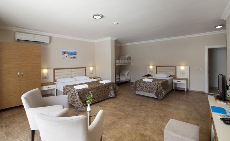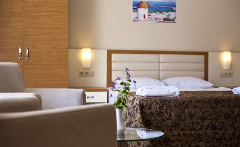 Хотелът разполага с общо 90 стаи, разположени в 3-етажна сгради, от които 70 Standard room (17 м²), 20 Large Room (35 м², спалня и двуетажно легло). Всички стаи са оборудвани с климатик, телевизор, телефон, баня с душ, сешоар, сет за чай/кафе, минибар (наличен само в деня на настаняване; безплатен за гости на All Inclusive), сейф (безплатен).