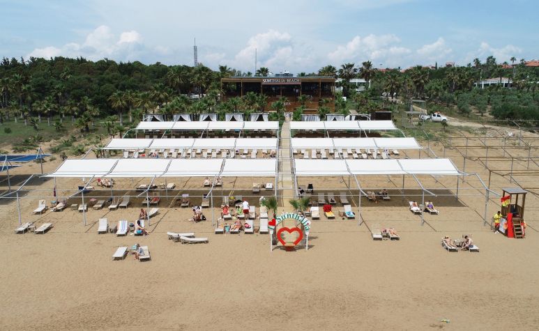 Собствен, на 500 м. от хотела, пясъчен. Безплатен шатъл до плажа (в определен часови диапазон). Чадъри и шезлонги на плажа и при басейна - безплатно. Плажни кърпи – срещу депозит.