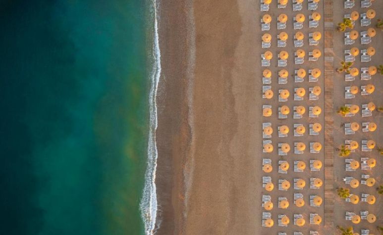 Собствен, пясъчно-чакълест с дължина 340 м. Чадъри, шезлонги и матраци на плажа и при басейна - безплатно.