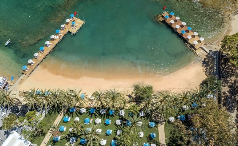 Собствен, пясъчен залив с дължина 200 м., 2 кея. Чадъри, шезлонги и плажни кърпи на плажа и при басейна - безплатно.