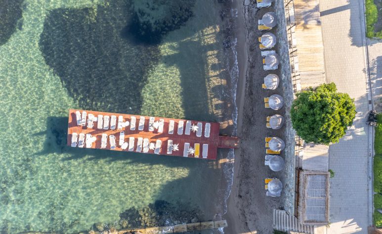 Собствен, пясъчно - чакълест. Чадъри, шезлонги и плажни кърпи (срещу депозит) на плажа и при басейна – безплатно.