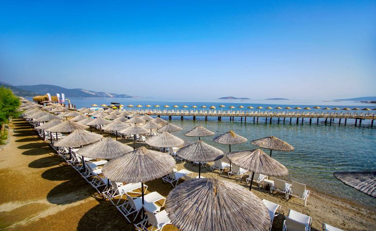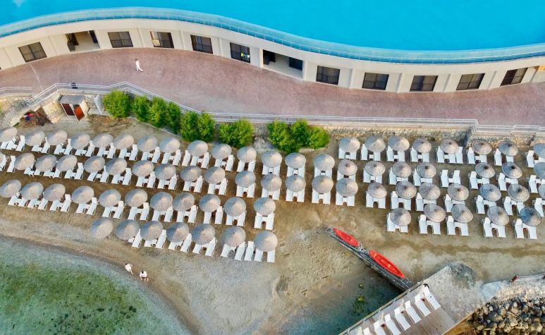 Собствен плаж и с платформа. При басейна и на плажа: чадъри, шезлонги и кърпи - безплатно.
