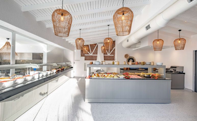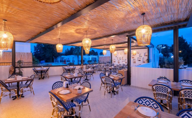 Основен ресторант, 2 а-ла-карт ресторанта (италиански, рибен / 1 безплатно посещение на 1 от ресторантите при минимум 7 нощувки съгласно концепцията на хотела с предварителна резервация), 1 бар, 1 открит басейн.