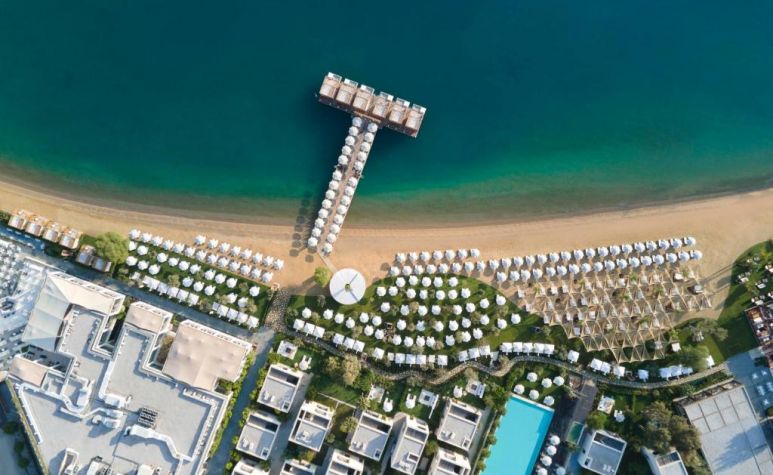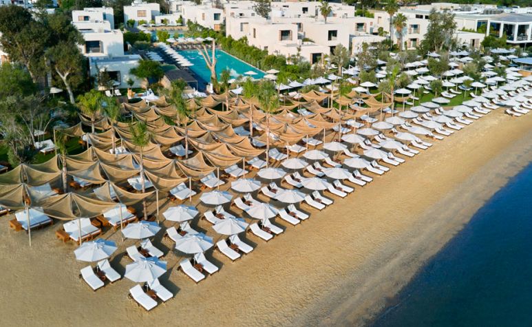 Собствен - 300м пясъчен, разделен на две части - фамилна и само за възрастни 16+; 2 платформи - чадъри, шезлонги и матраци на плажа и при басейна - безплатно.
