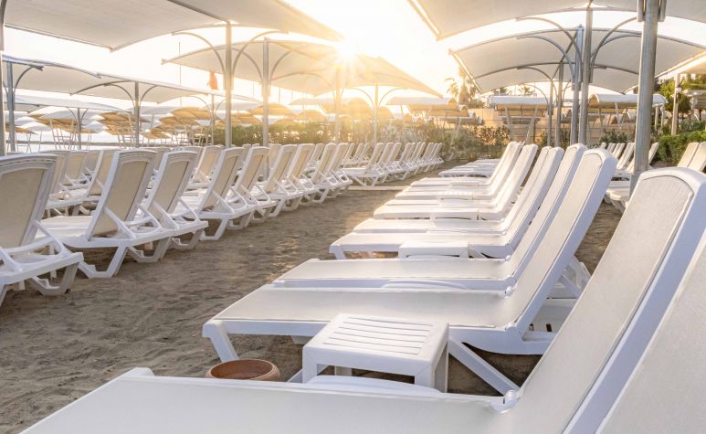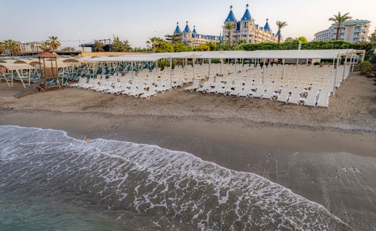 Собствен, пясъчно - чакълест. До плажа се стига посредством подземен тунел. Чадъри, шезлонги и плажни кърпи на плажа и при басейна – безплатно.