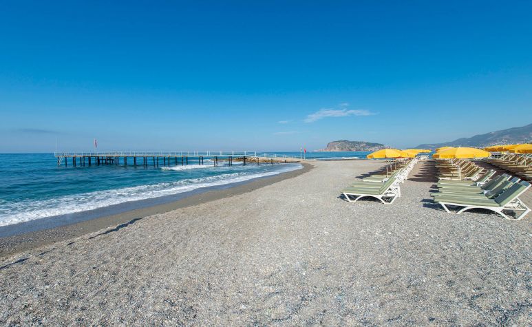 Собствен пясъчно-чакълест, чрез подлез. Плажни кърпи, чадъри, шезлонги на плажа и при басейна - безплатно, на кея - срещу доплащане.
