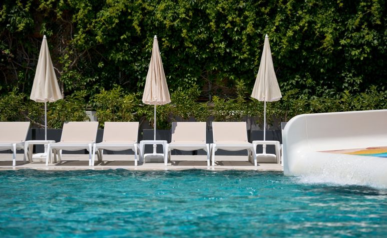Собствен плаж, на 250 м. от хотела, пясъчно - чакълест. Чадъри, шезлонги и кърпи на плажа и при басейна – безплатно
