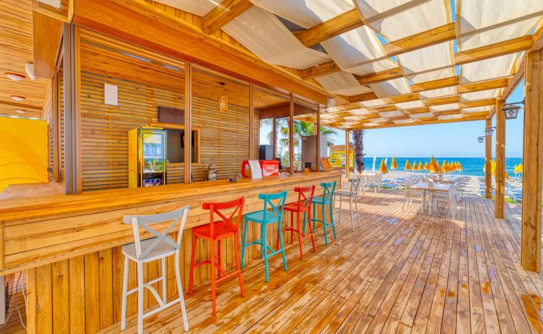 Собствен, на 500 м от хотела, пясъчно - чакълест. До плажа се стига посредством подземен тунел, предлага се и безплатен шатъл бус. Чадъри, шезлонги и плажни кърпи на плажа и при басейна – безплатно.